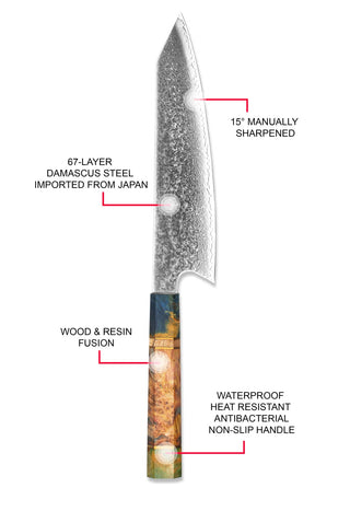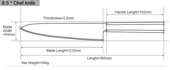 - 8.5-inch Chef, 8-inch Butcher, 8-inch Kiritsuke, 7-inch Santoku, and 7-inch Nakiri options.